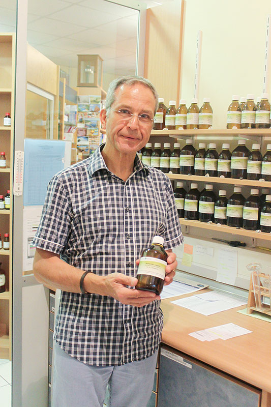 anbieten. Meine Mitarbeiterin Manuela Carstensen hat sich als Apothekerin dazu gezielt weitergebildet. Sehr individuell berät sie Menschen, die unter anderem unter Übergewicht oder Lebensmittelunverträglichkeiten leiden. Sie hilft und begleitet bei der teils nötigen Lebensumstellung. Ein weiterer Schwerpunkt liegt bei uns in der Beratung zu naturheilkundlichen Therapieformen. Wir können hier auch individuell spagyrische Arzneien herstellen, die aus einer Auswahl von 104 pflanzlichen Einzelessenzen gemischt werden. Das sind sehr energiereiche Medikamente, die da für unsere heutige Zeit entstehen, Die Spagyrik geht übrigens auf Paracelsus und Methoden der Alchemie zurück.