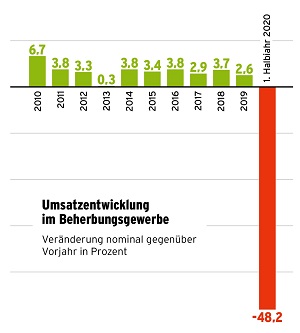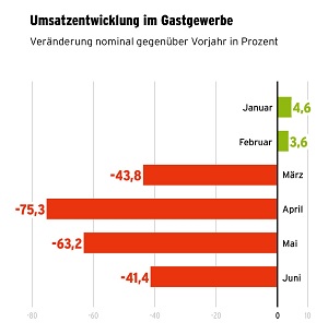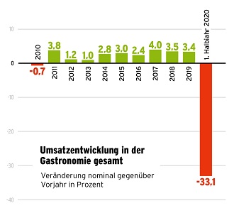 Das Statistische Bundesamt wies für das erste Halbjahr ein nominales Umsatzminus von 38,5 Prozent aus. Der coronabedingte Shutdown im Frühjahr hat riesige Löcher in die Bilanzen der Gastronomen und Hoteliers gerissen. Wie sehr die Branche unter Druck steht, belegen die Ergebnisse einer Umfrage, die der Dehoga-Bundesverband Anfang September vorstellte. Dafür wurden kurz zuvor rund 5600 Unternehmen befragt. Trotz der zu dieser Zeit mancherorts gut gefüllten Biergärten und Ferienhotels, belegen die Ergebnisse, dass die Krise noch längst nicht vorbei ist. Konnten manche Urlaubsorte im Sommer ein Stück weit aufatmen, so sieht die Perspektive in den Städten ganz anders aus. Die Lage der Tagungs- und Stadthotels, der Eventcaterer und Diskotheken ist weiterhin dramatisch. Rund 61,6 Prozent der gastgewerblichen Unternehmer bangen um ihre Existenz.